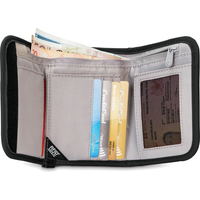 Praktische portemonnee met RFID bescherming en afneembare polslus in een compact formaat